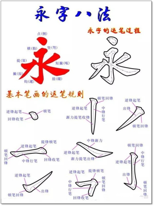 永字八法: 永字八法是以“永”字的八种笔画为要素,阐述楷书的写法,依次分为:侧、勒、弩、趯、策、掠、啄、磔。通俗的讲,就是汉字的点、横、竖、撇、捺、挑、折、钩等八种笔画,其通过拆分法,几乎涵盖了汉字书法所有最基础的“部件”。