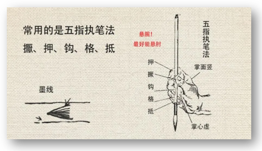 1、执笔方法:推荐“五指执笔法”(擫、押、钩、格、抵),手指自然弯曲,掌心空虚,笔杆垂直,松紧适度(以提起笔不掉落为宜)。