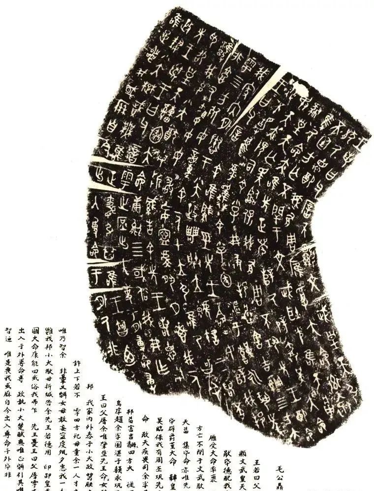 西周: 金文(钟鼎文)——笔画趋于圆润,结构疏密有致,字形均衡,字体庄重典雅,排列布局整齐美观——代表:《毛公鼎》(“金文之冠”497个字)