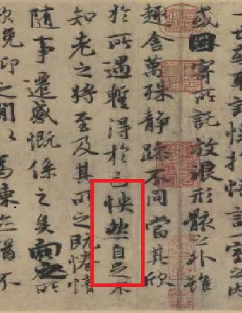 但是,作为著名的书法家,王羲之不太可能将“怏”字写成“快”,也不会将“快”字写成“怏”,且作品完成后一定会进行仔细检查勘误,其中原作中多出划改、涂抹、添加痕迹就是佐证。